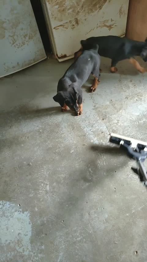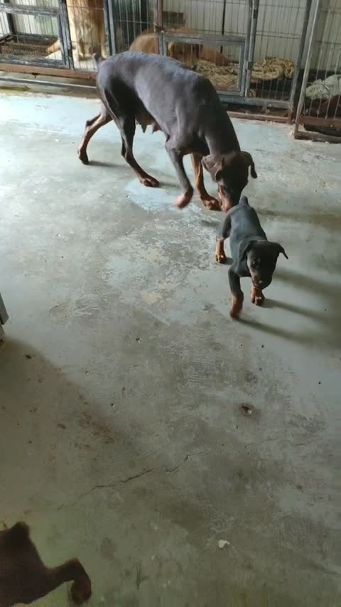 金毛当保姆,带小杜宾玩一会...?